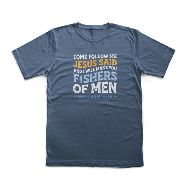 In Matthew 4:19, Jesus calls Peter and Andrew to be his disciples with an attention-grabbing invitation: “Follow me, and I will make you fishers of men.” Invite others to consider Jesus’ invitation to follow him with this thought-provoking tee.